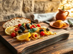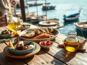 - małą sałatkę z pomidora i ogórka z lokalną oliwą,